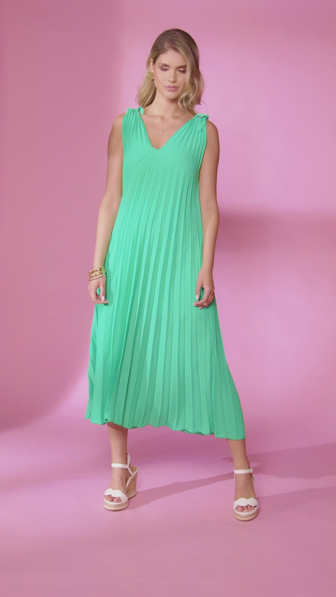 Get ready for the Kate Cooper totally pleated maxi dress. This lightweight pressed pleat dress is the perfect high summer option for any occasion. Extra details include a delicate bow to each shoulder and a show stepping colour.